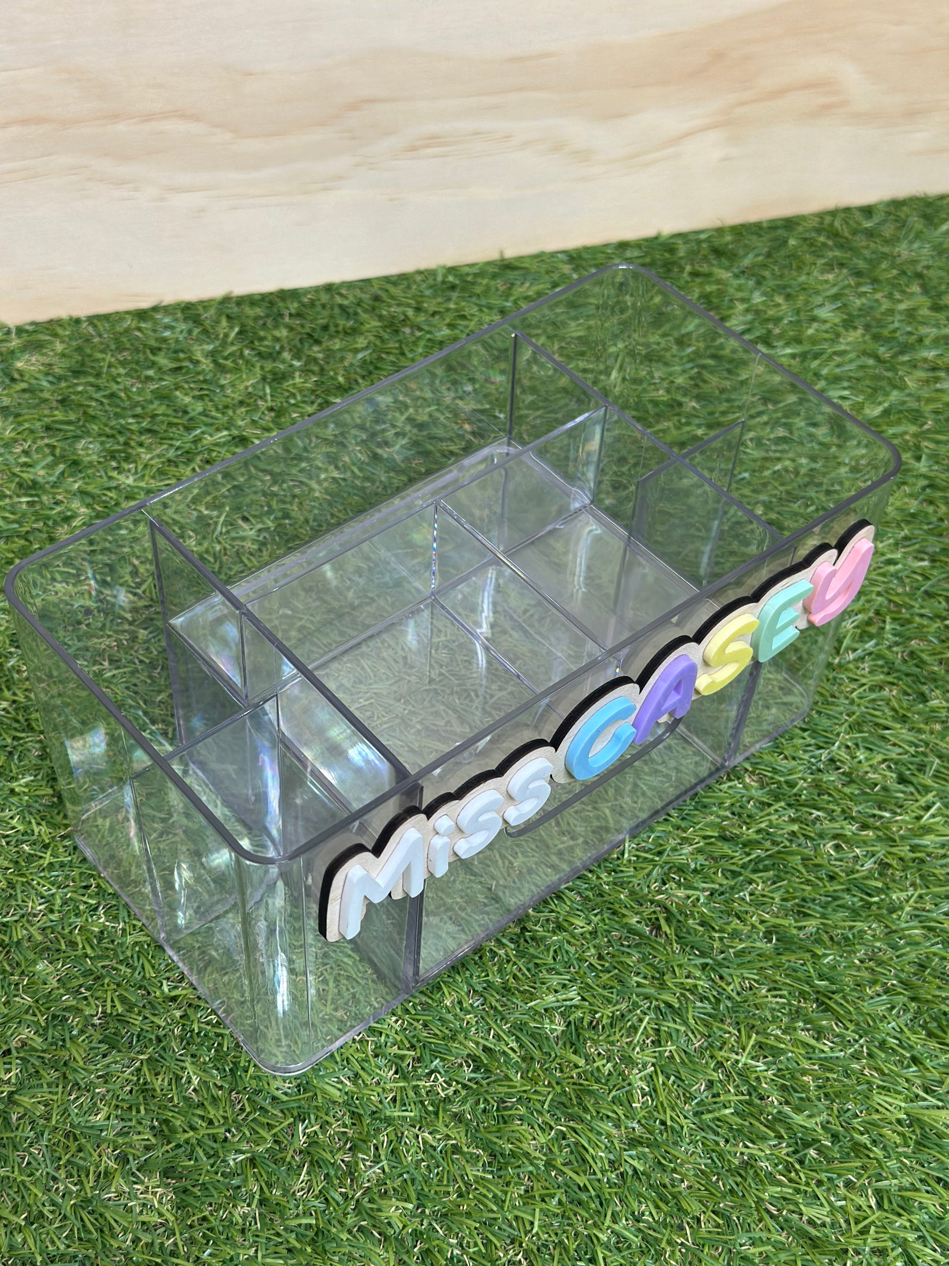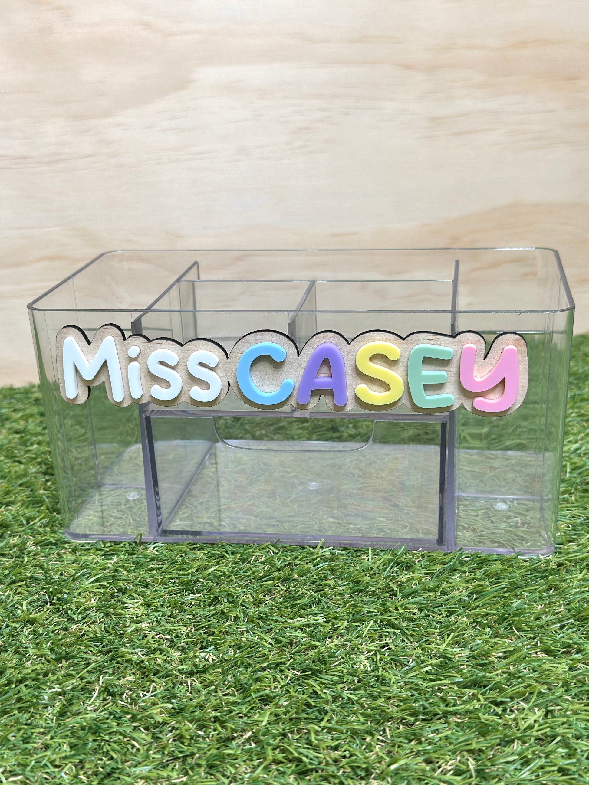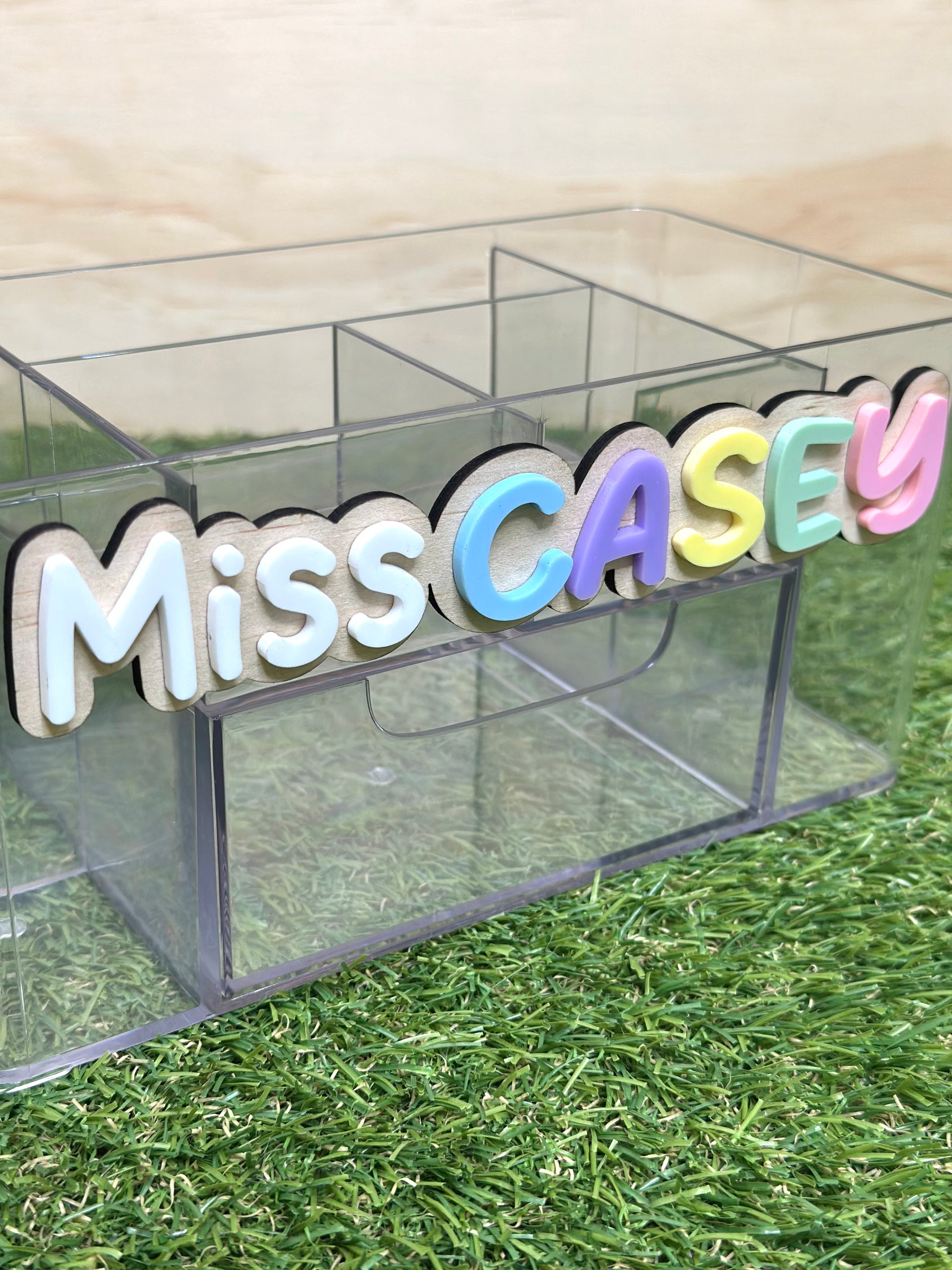 Personalised with your teacher's name in pastel rainbow acrylic.
